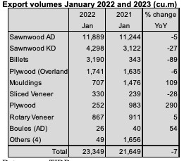 Parmi les principaux produits exportés, les exportations de sciages séchés à l’air et au séchoir ont été délimitées au début de 2023. Le volume total des deux produits a diminué de 11 % en janvier 2023 par rapport à janvier 2022.